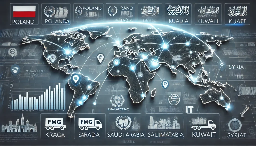 Our activities are based on an in-depth knowledge of markets such as Poland, Iraq, Saudi Arabia, the United Arab Emirates, Kuwait, and Syria. We specialize in high-growth potential sectors: FMCG, pharmaceuticals, and IT, making us the ideal partner for business expansion in these industries.